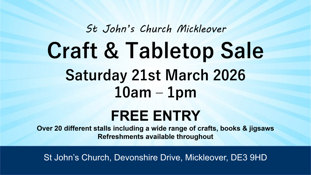St Johns Craft and Tabletop Sale – Saturday 21st March 10am to 1pm. Donations of small cakes or tray bakes are welcome. St John’s stalls are refreshments, small bakes, books and jigsaws. There is no Bric-a-brac stall this time. Do invite family and friends to visit – there’s over 20 stalls to browse. Any assistance with setting up on Friday 20th from 3.30pm and with clearing away from 1pm on Saturday would be much appreciated. Joy and Richard